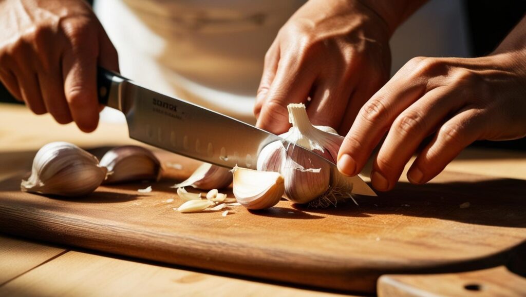 - Aplástalo con el cuchillo: Coloca el diente de ajo debajo de la hoja ancha de un cuchillo y dale un golpe seco. La piel se desprende al instante.